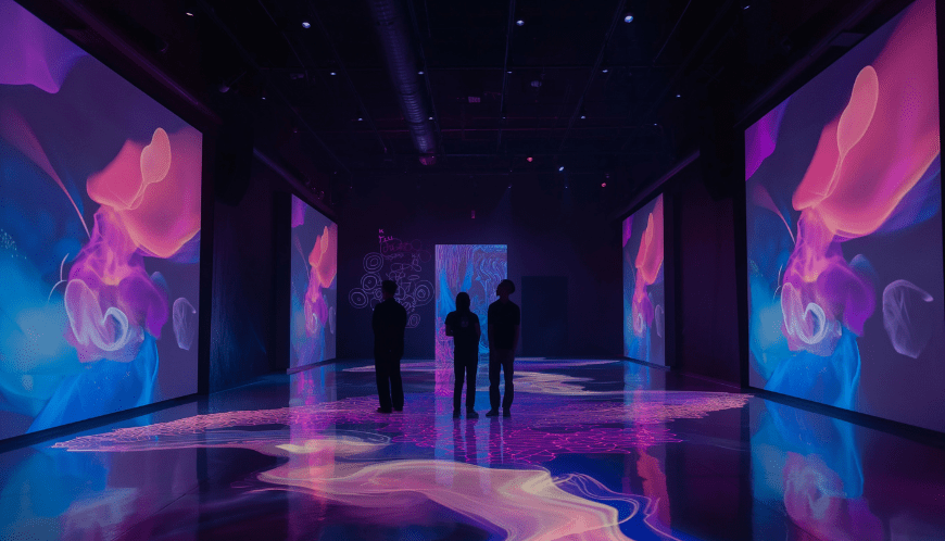 Immersive projection rooms use high brightness projectors and seamless edge blending to convert walls, floors, and ceilings into fully dynamic content spaces.